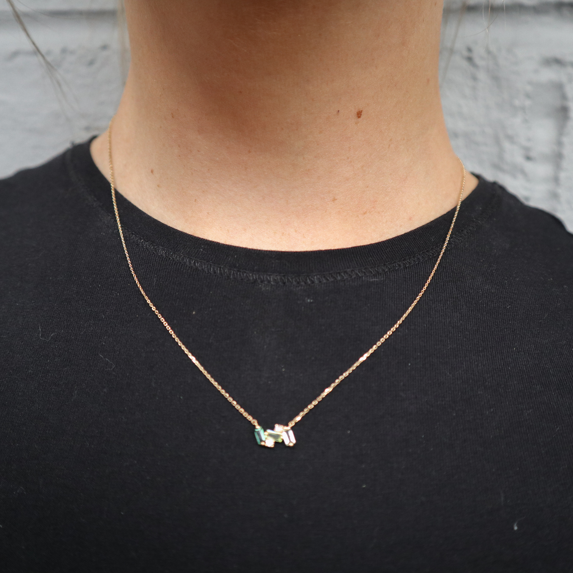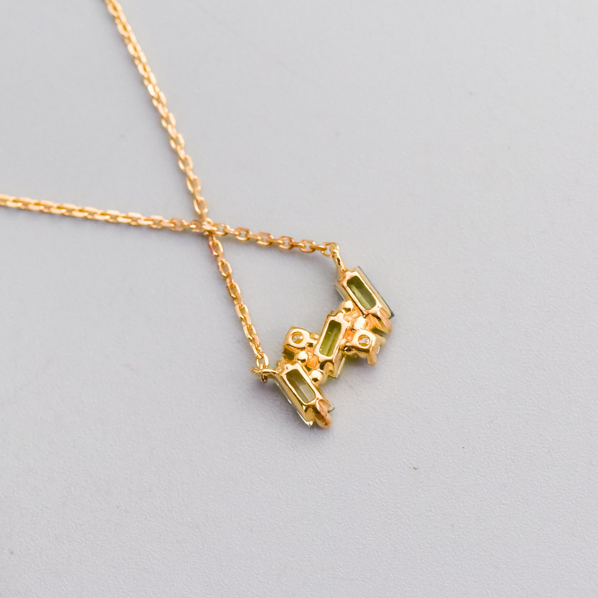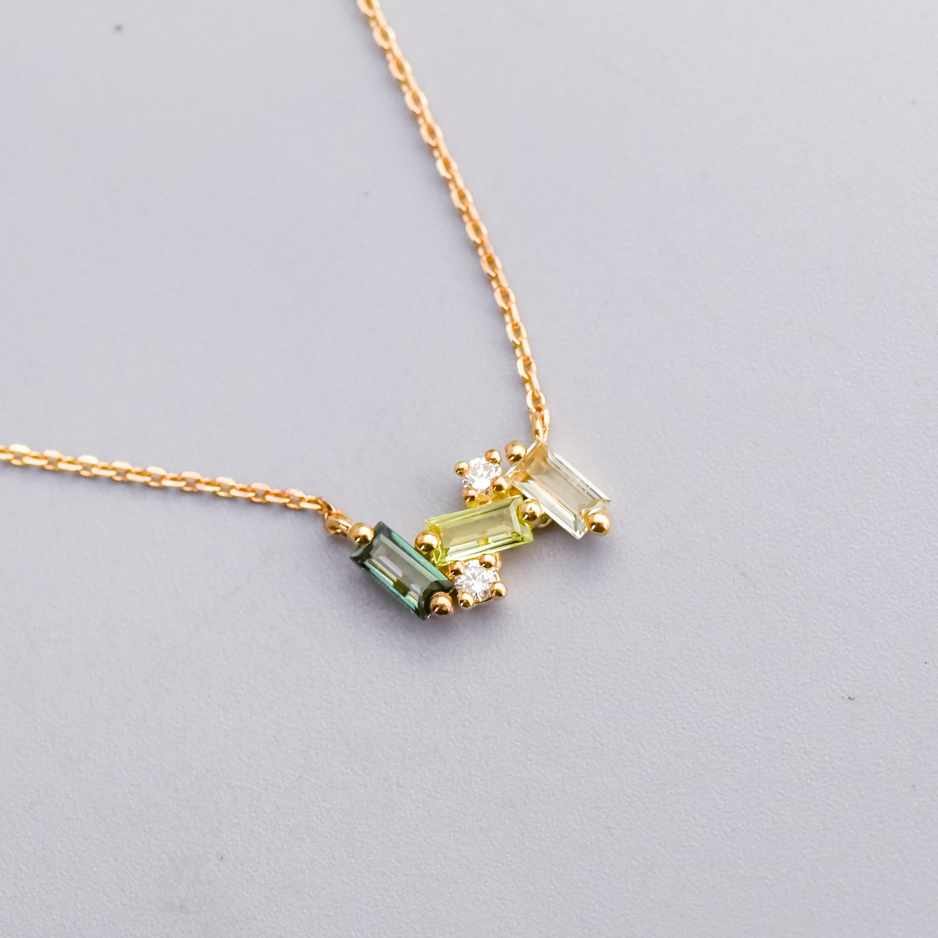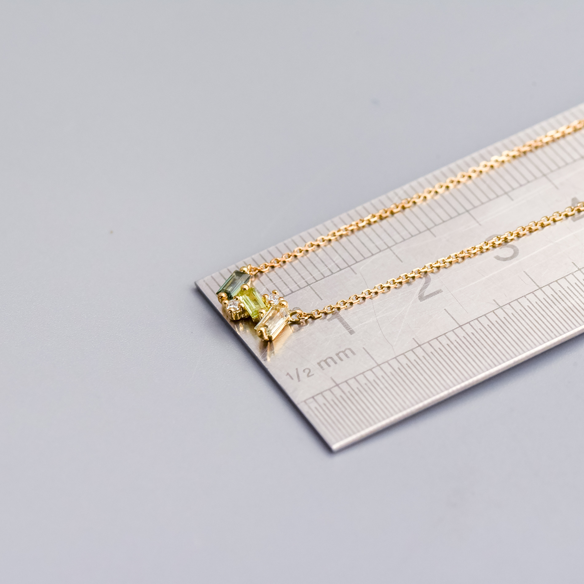 The pendant showcases three baguette-cut gemstones – a deep green topaz, a lighter peridot, and a pale green amethyst – graduating beautifully in colour.