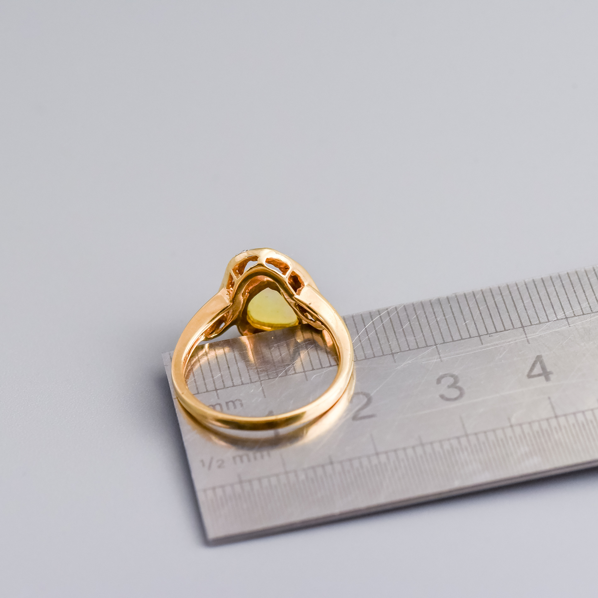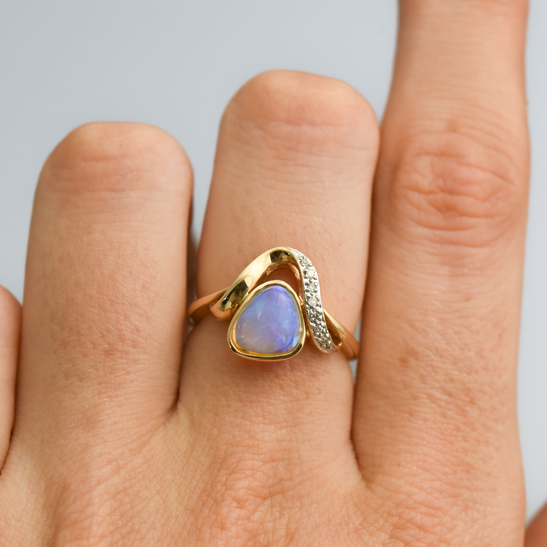 A ribbon of gold curves above the opal, pavé set with small diamonds that add a delicate shimmer and highlight the sculptural lines of the setting.