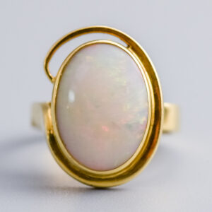 A 14ct gold opal and diamond ring with an abstract, flowing swirl design that gives the piece a sense of movement.