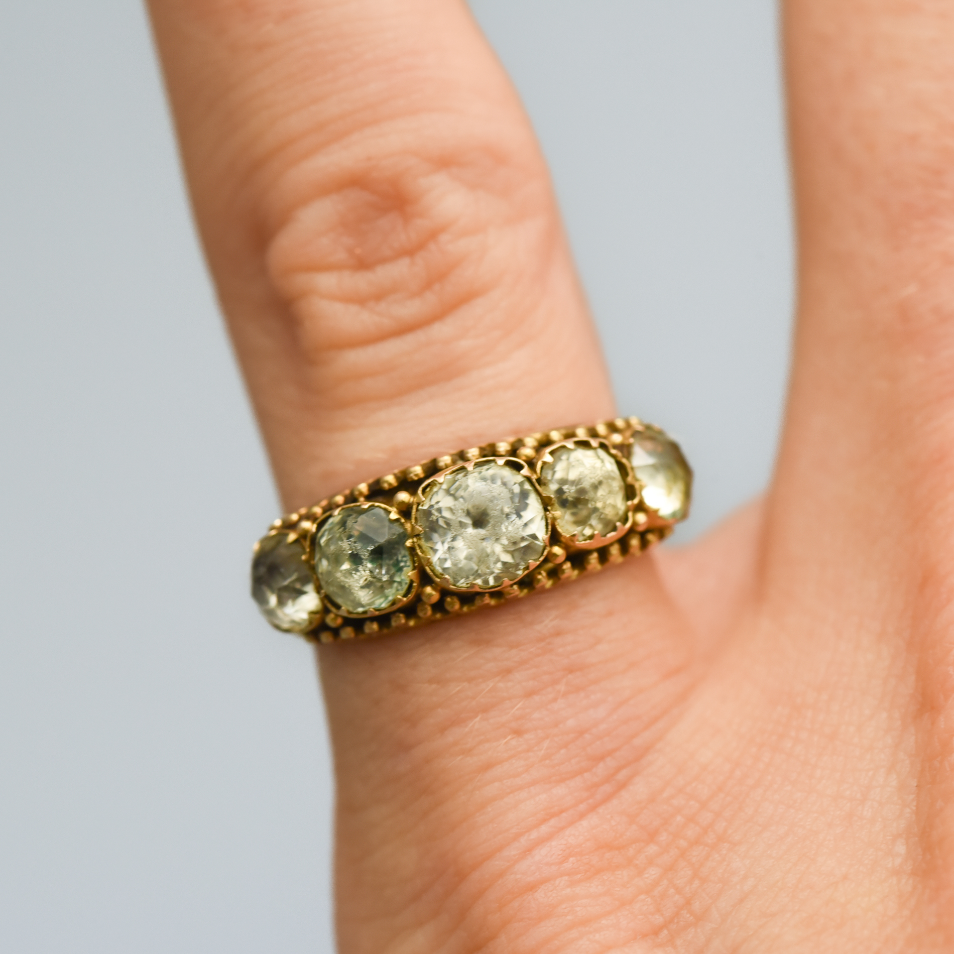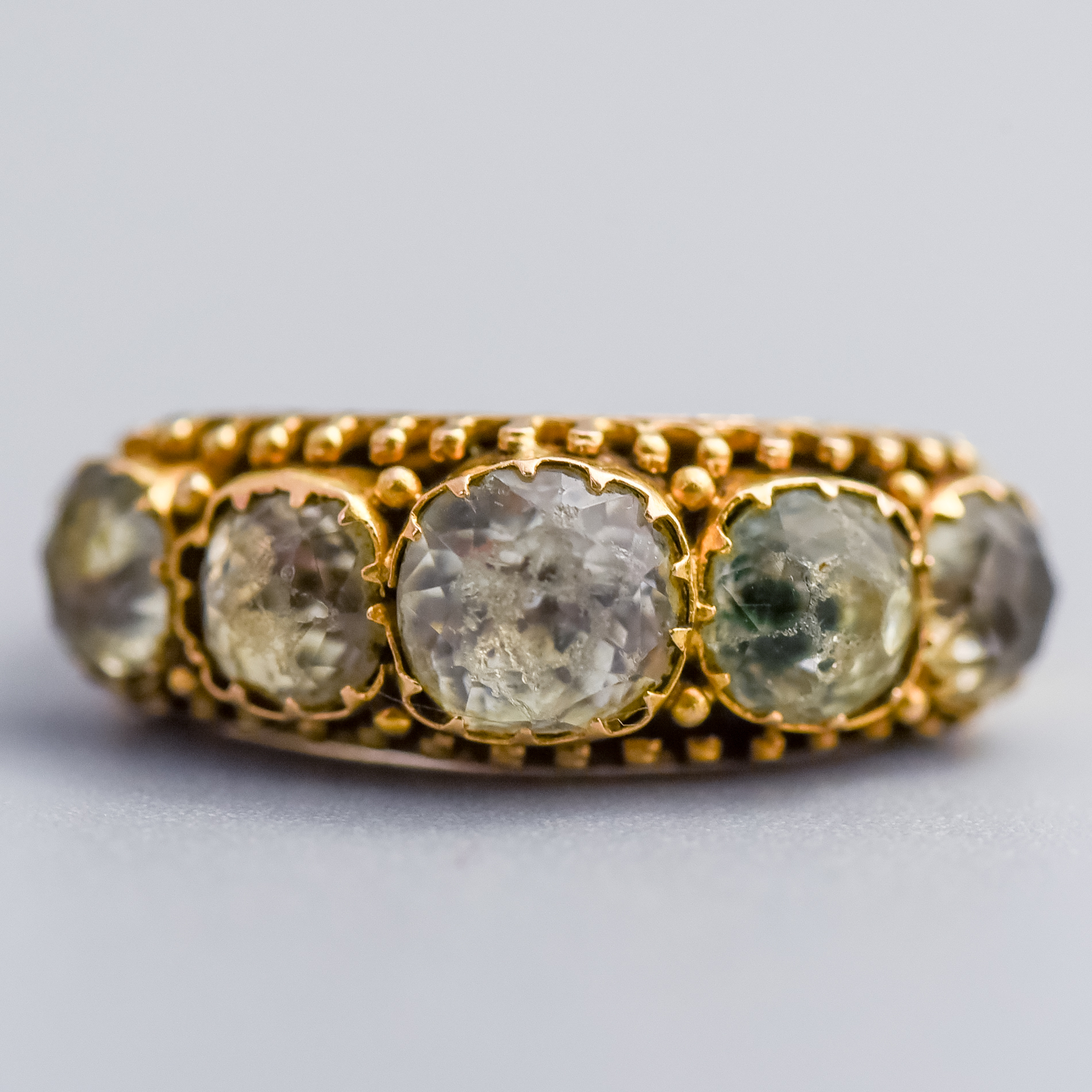 This piece is a captivating example of early 19th-century craftsmanship. It features five cushion-cut white paste stones set in individual collets, showcasing the traditional use of paste gemstones in Georgian jewellery.