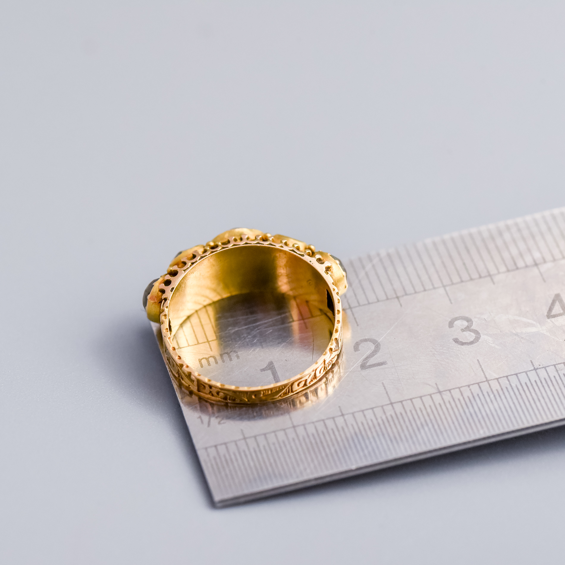 Antique piece in fair condition. The stones show noticeable wear to their surfaces, including scratches and minor chips. There is also green discolouration behind the stones. Please see images for further detail.