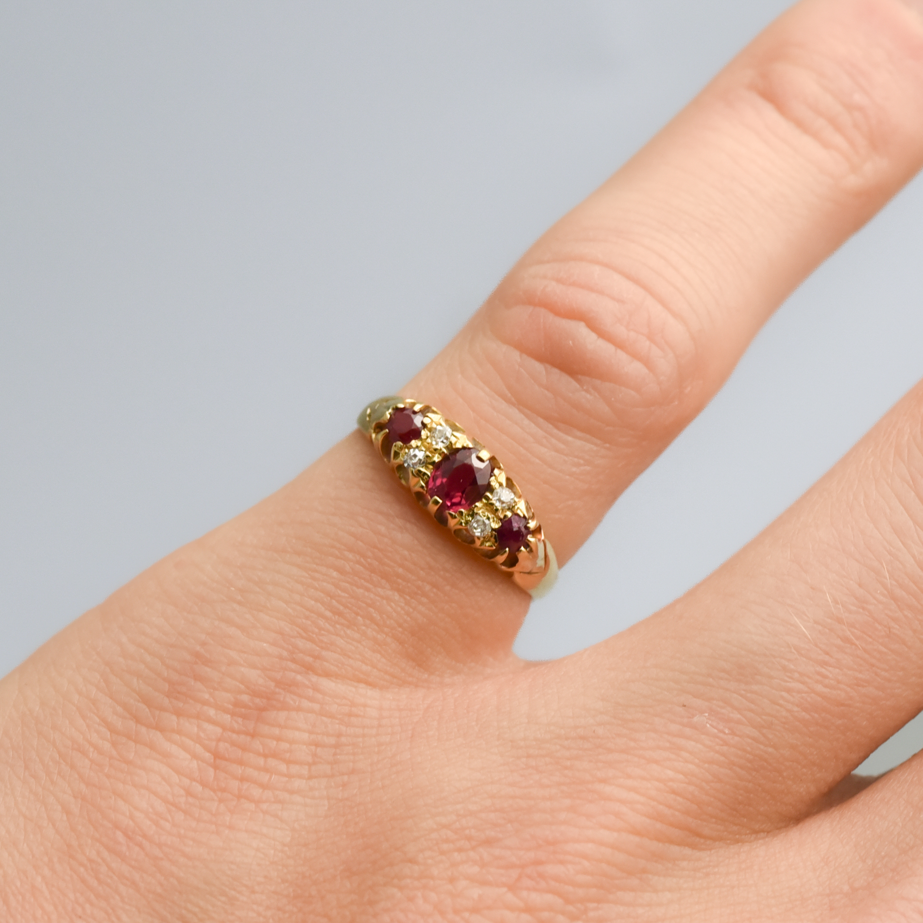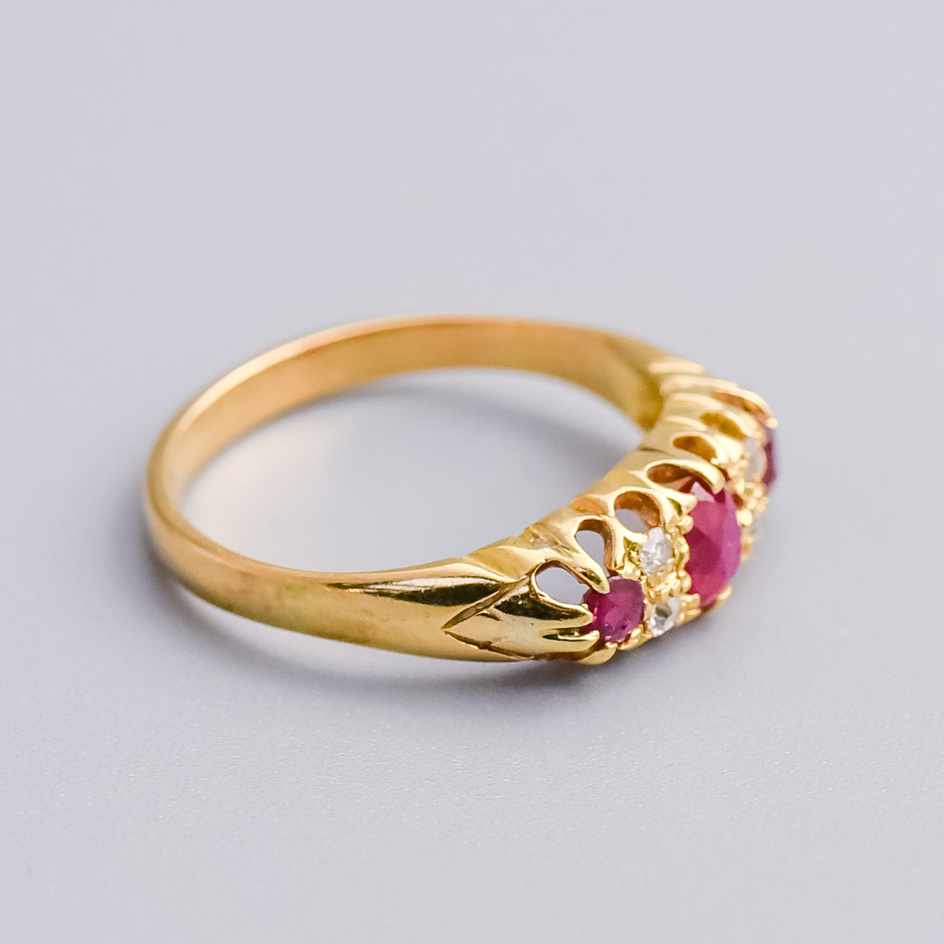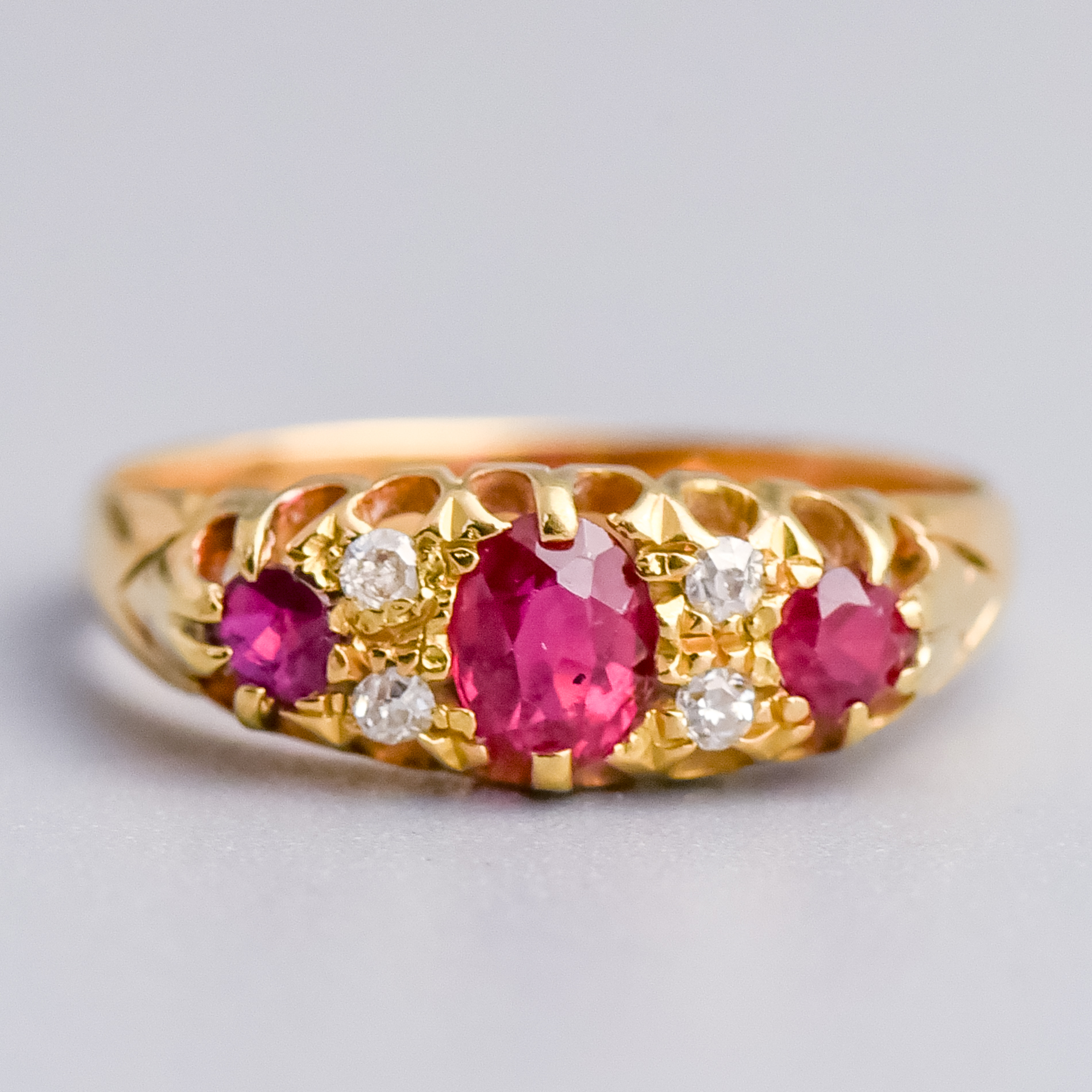The stones are in overall good condition, showing light age-related wear, particularly on the rubies, though this is barely visible to the naked eye. The diamonds are near colourless but feature visible cloudy inclusions.