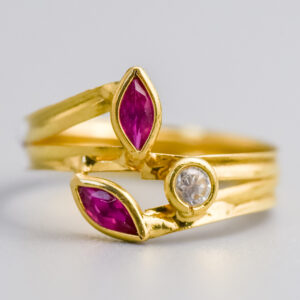 The warm red/purple of the rubies pairs beautifully with the soft, shifting tones of the opals, creating a bright and distinctive look.