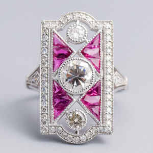 This Victorian ring features a colourful two-row design, with six cushion cut rubies forming the top row and six round cabochon opals set just beneath.