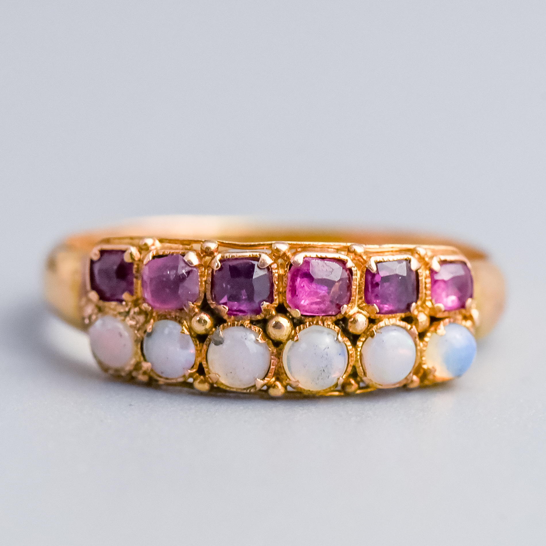 This Victorian ring features a colourful two-row design, with six cushion cut rubies forming the top row and six round cabochon opals set just beneath.