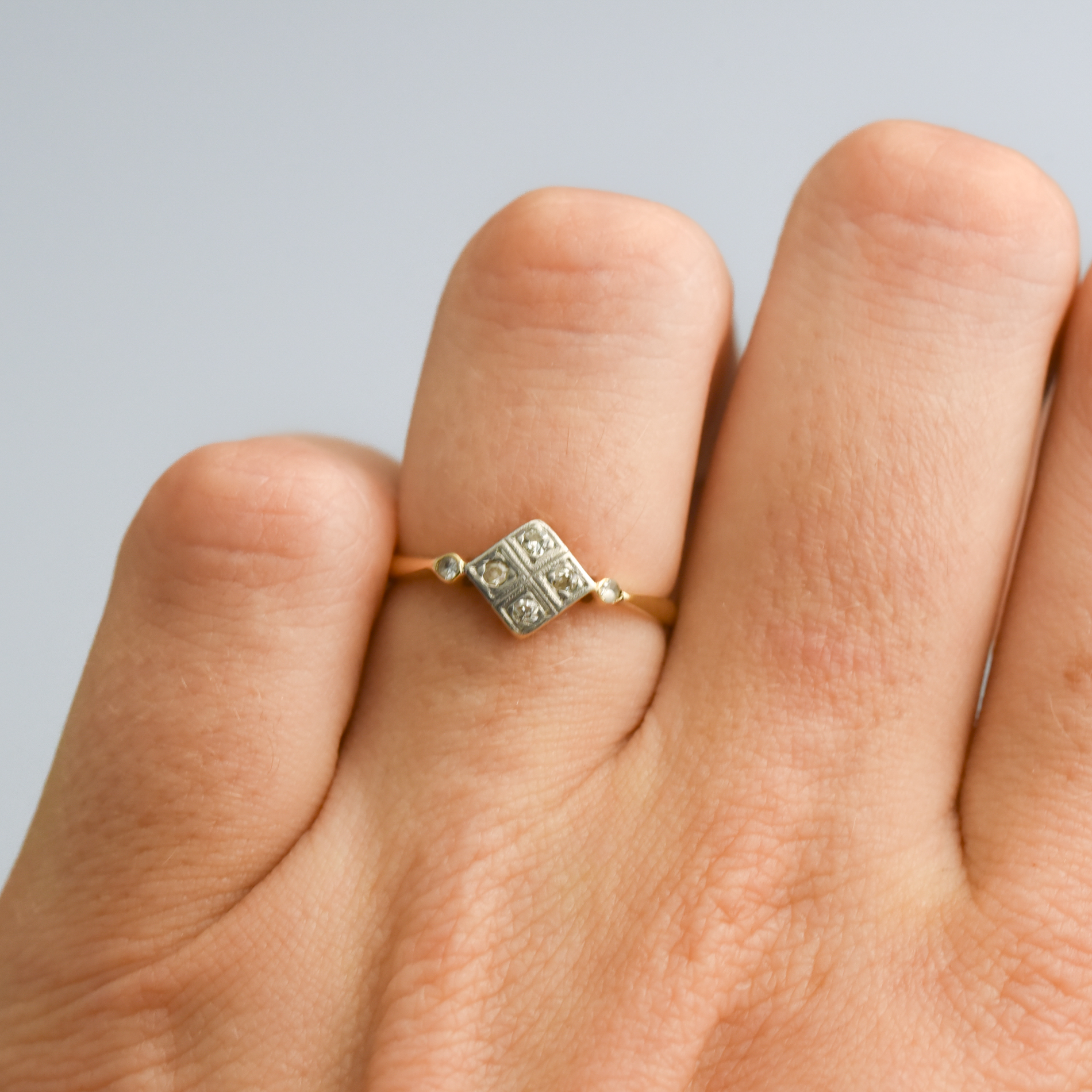 An 18ct gold Art Deco diamond panel ring, featuring a central diamond-shaped platinum top set with a small round diamond at each corner, framed by delicate milgrain detailing.