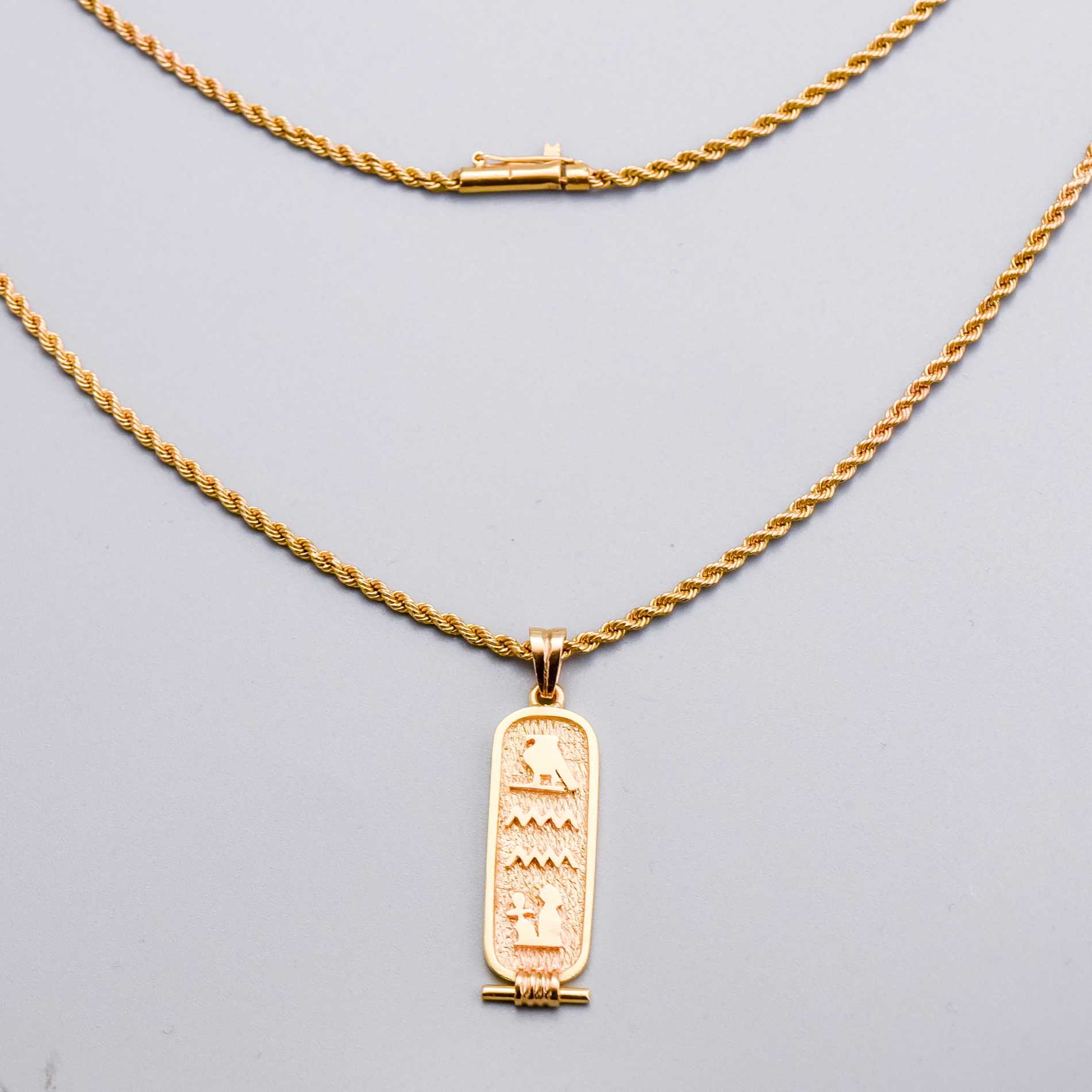 The necklace features a traditional Egyptian cartouche pendant suspended from a rope chain.