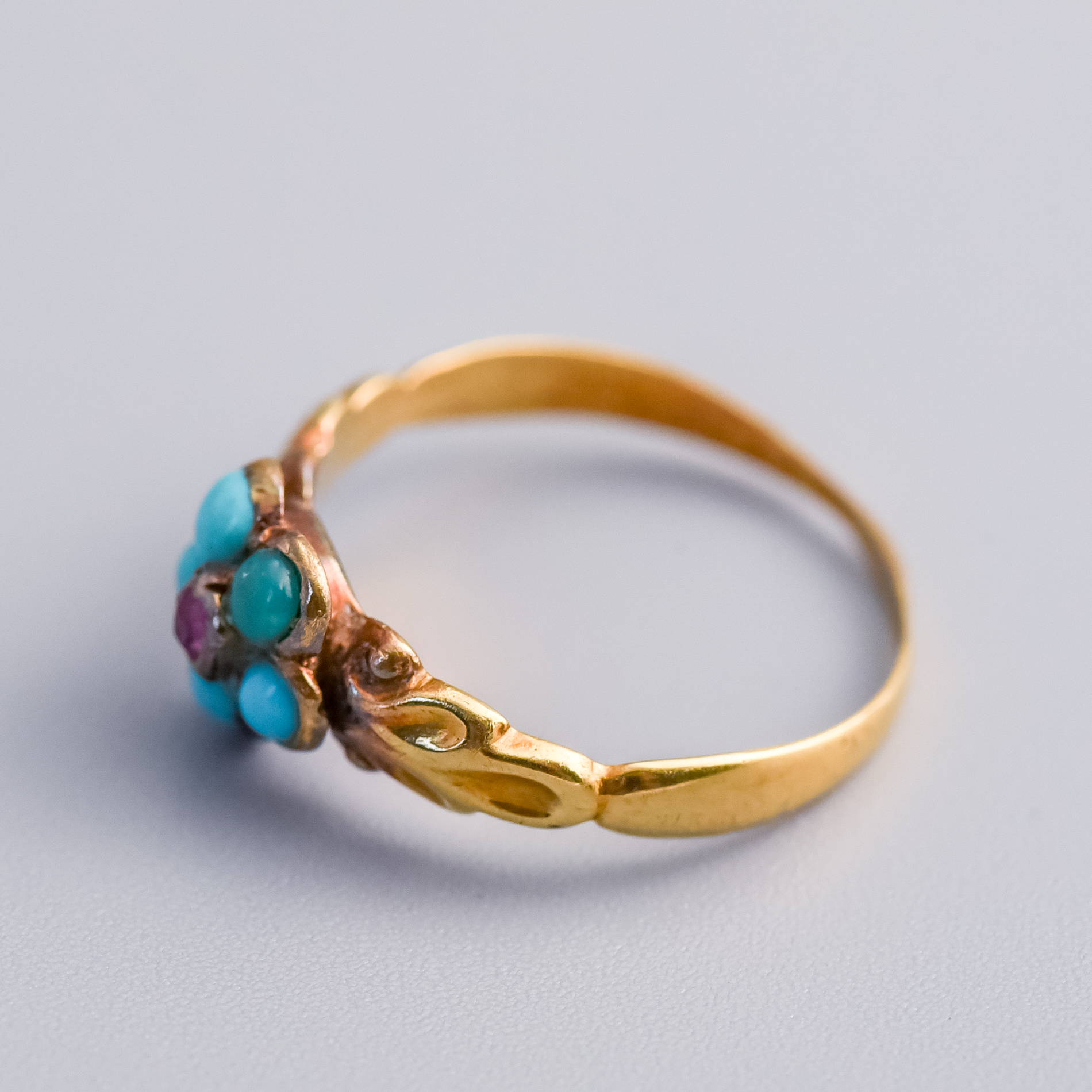 An 18ct gold Georgian Forget-Me-Not ring, featuring a central cushion-cut ruby set in a gold bezel and surrounded by five cabochon turquoise stones to form the traditional Forget-Me-Not flower cluster.