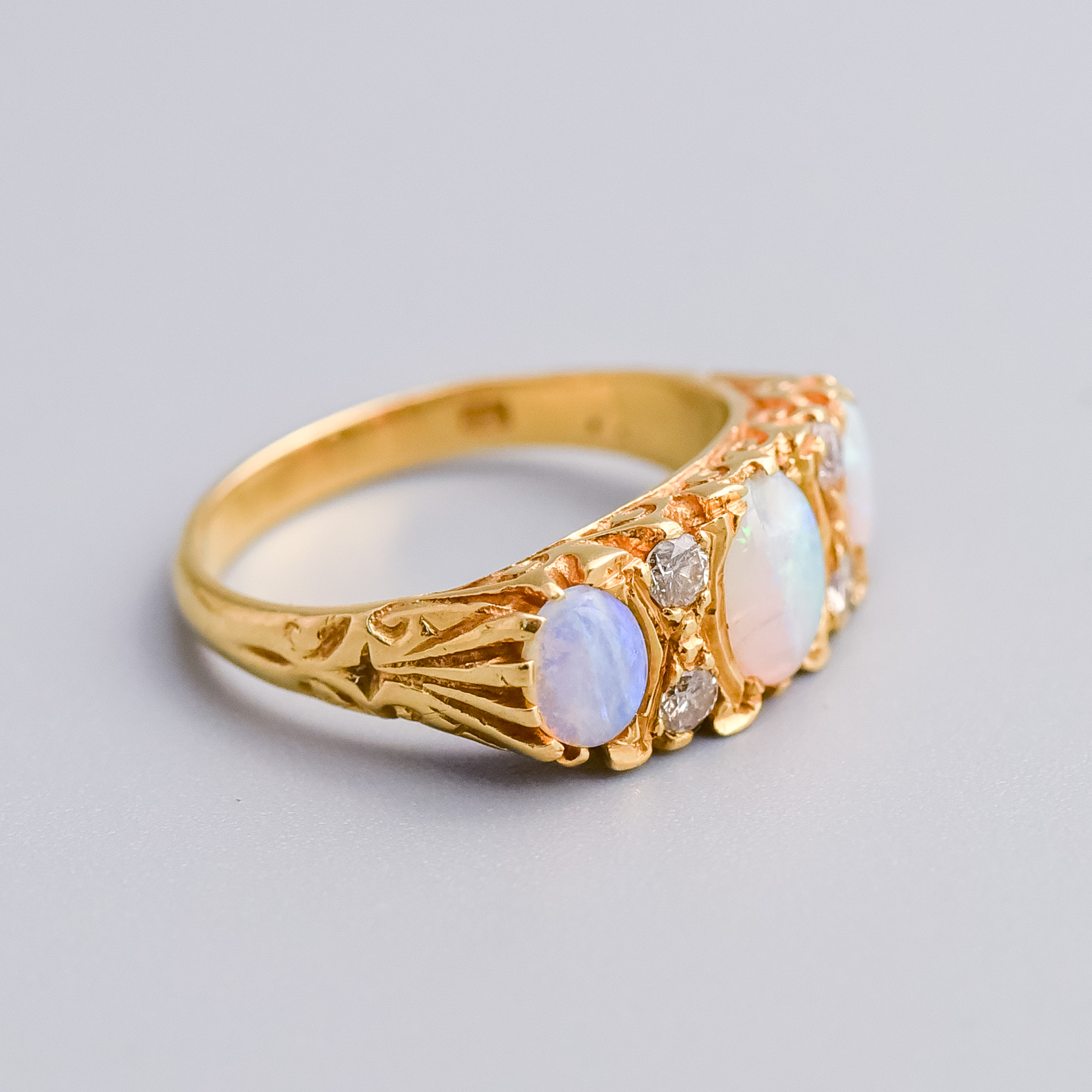 This 18ct gold half-hoop ring features three central oval cabochon opals, each displaying a luminous play of colour. Between the opals are pairs of stacked round-cut diamonds, adding sparkle and contrast.