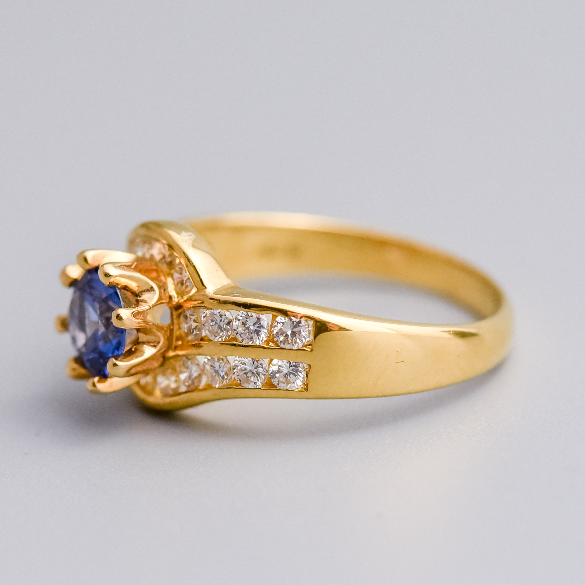 The stones are in good overall condition. The sapphire shows more signs of wear than the diamonds, with minor abrasions along its facets. The diamonds are in excellent condition, uniform in colour and size.