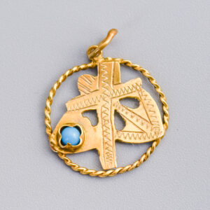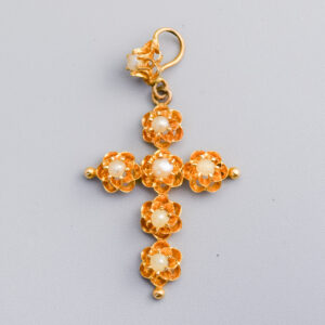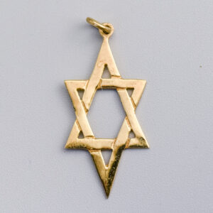 An 18ct gold Victorian mourning pendant featuring an oval black onyx panel, centred with a gold star outline set with seed pearls.