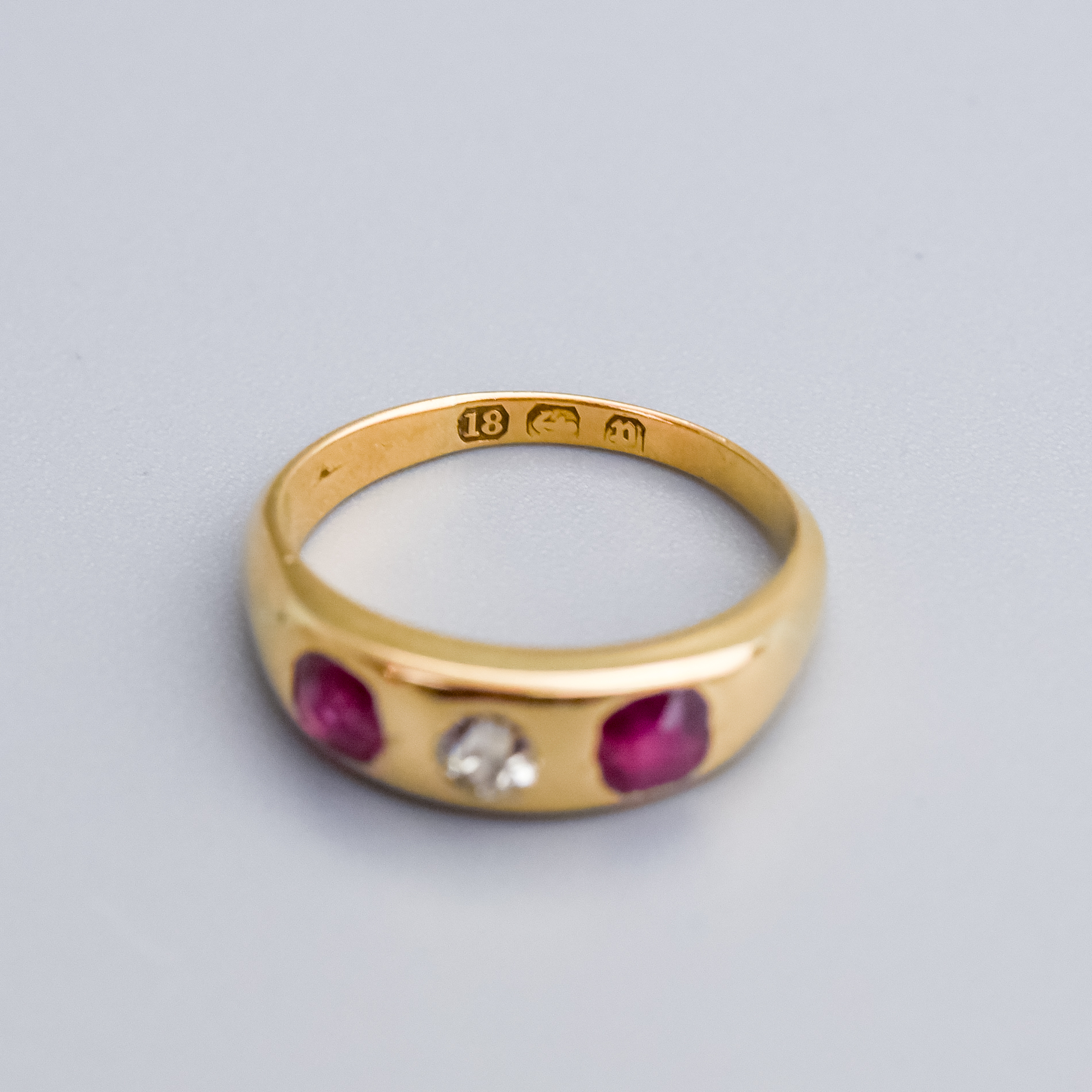 Antique piece in good condition. Rubies show signs of age related wear, including scuffs and small scratches. See images for more detail.