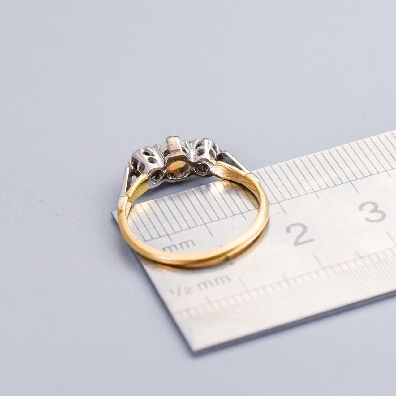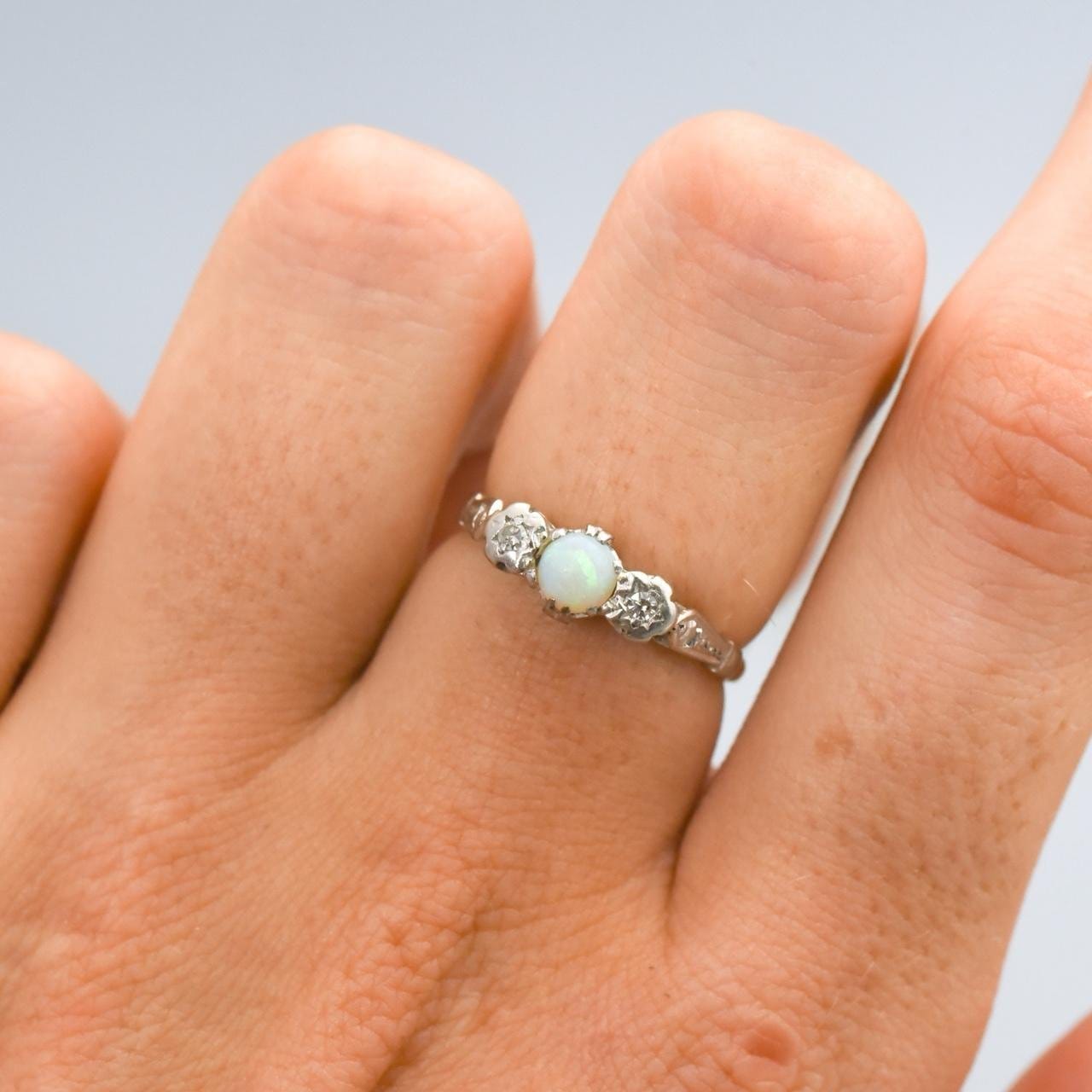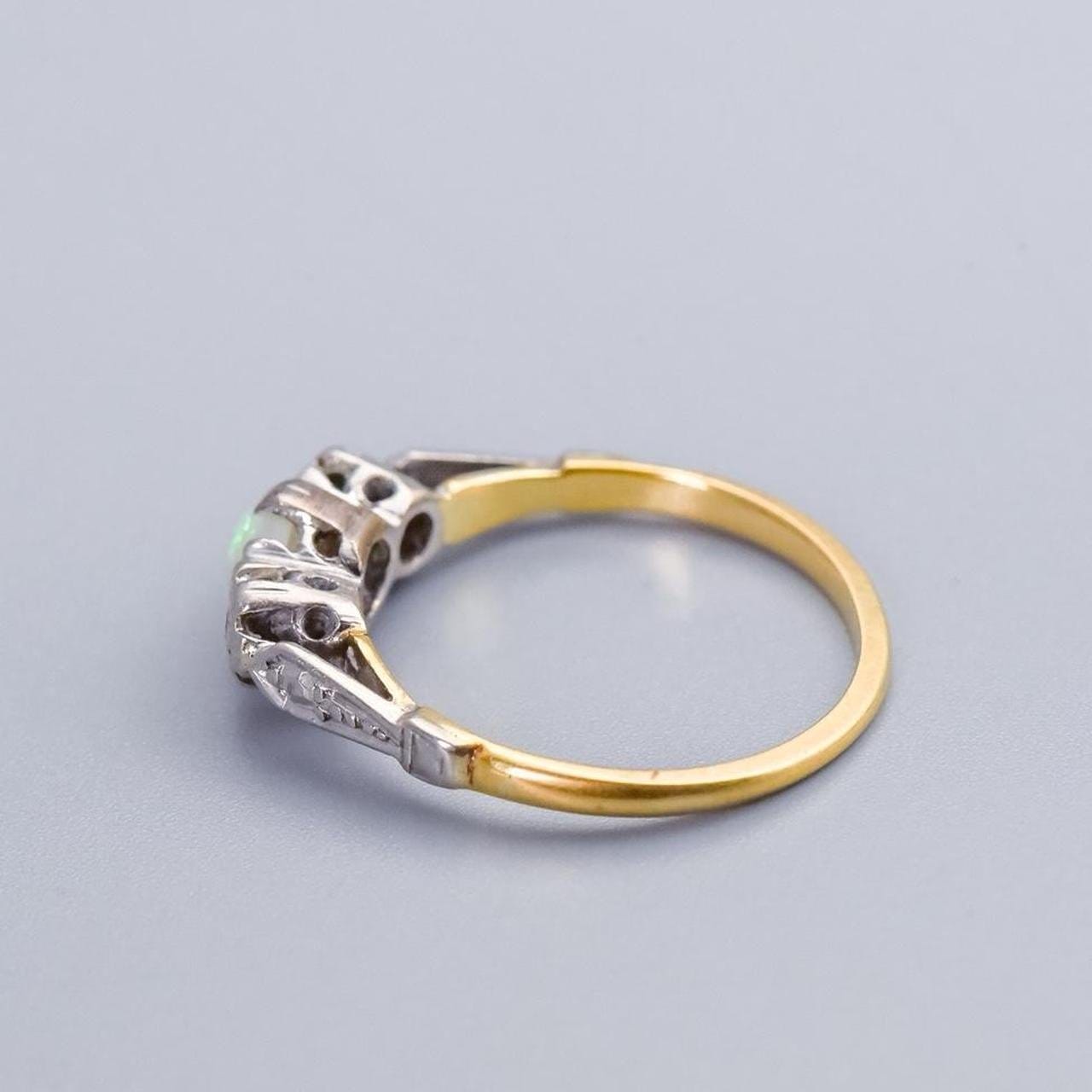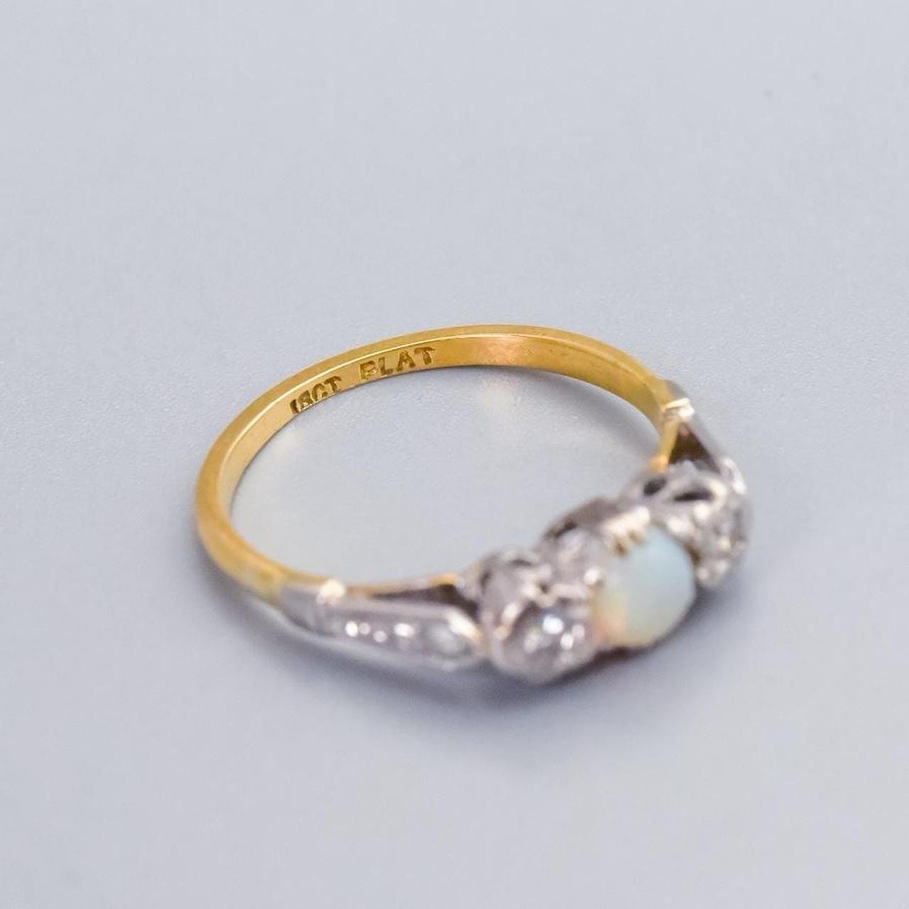 This 18ct gold Art Deco ring features a central round cabochon opal with a soft, luminous glow, set in a platinum double-claw setting.