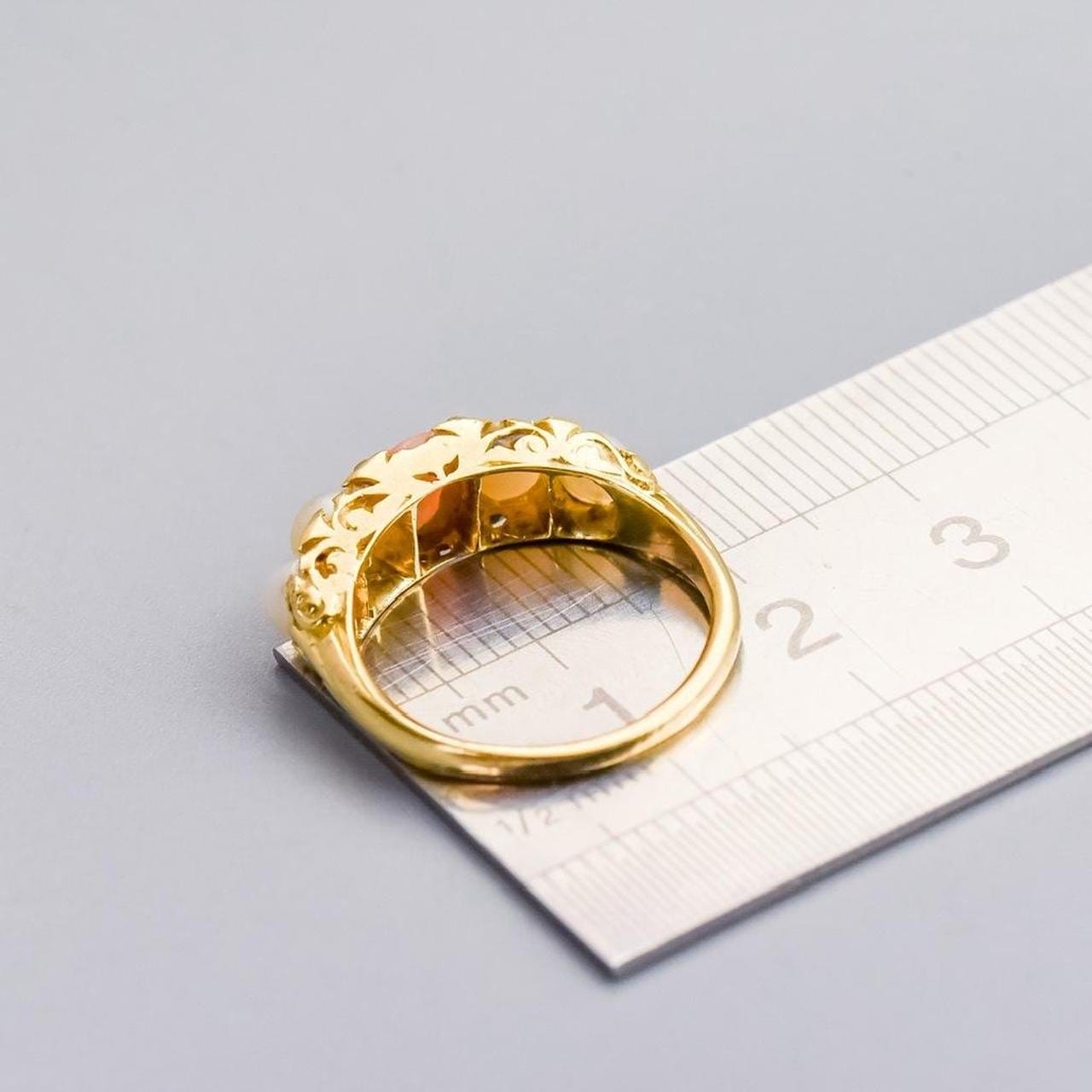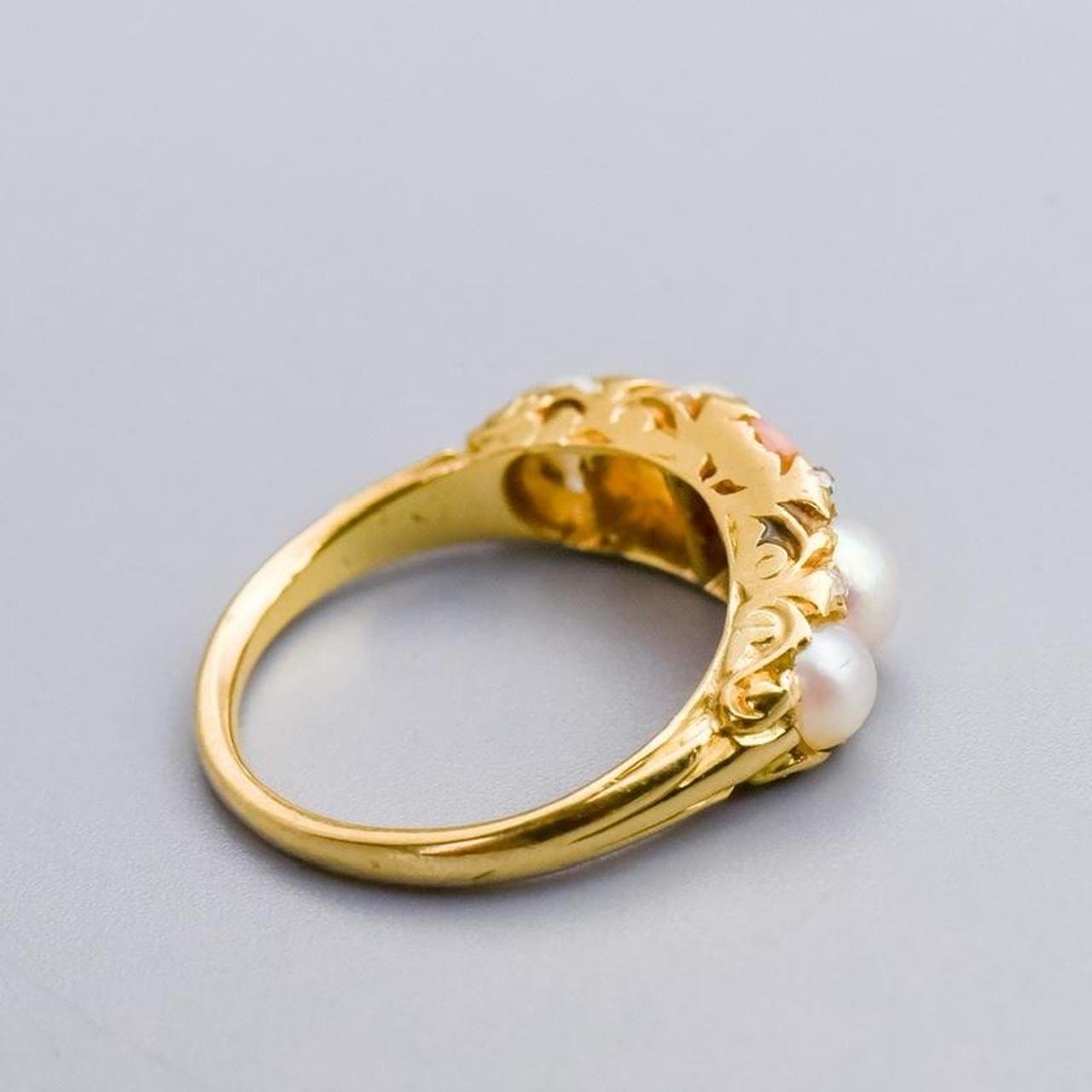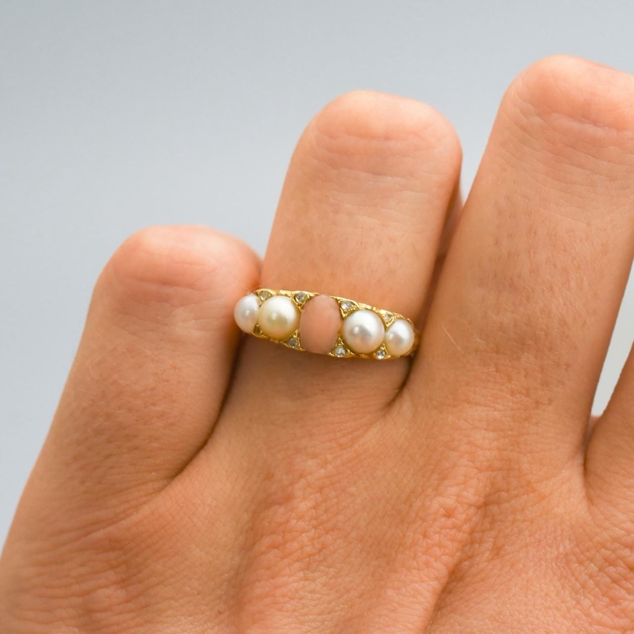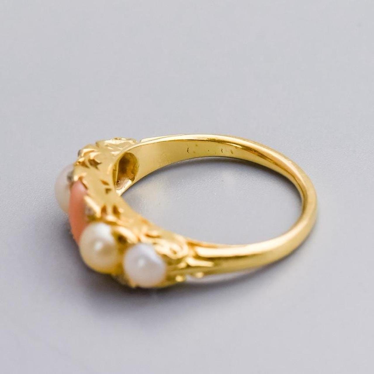 This exquisite Victorian half hoop ring is crafted in rich 18ct gold and centres on a warm oval peach coral, flanked on each side by graduating pearls that add a soft, lustrous contrast.