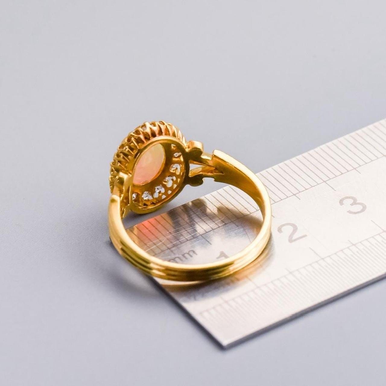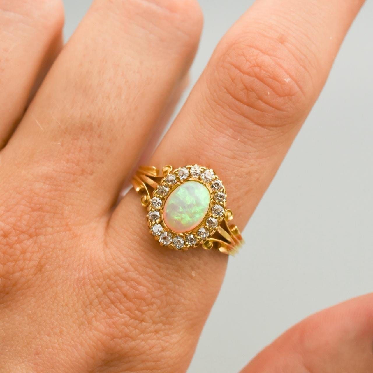 Surrounding the opal is a halo of sixteen old mine cut diamonds, each adding gentle sparkle and contrast to the glowing centre.