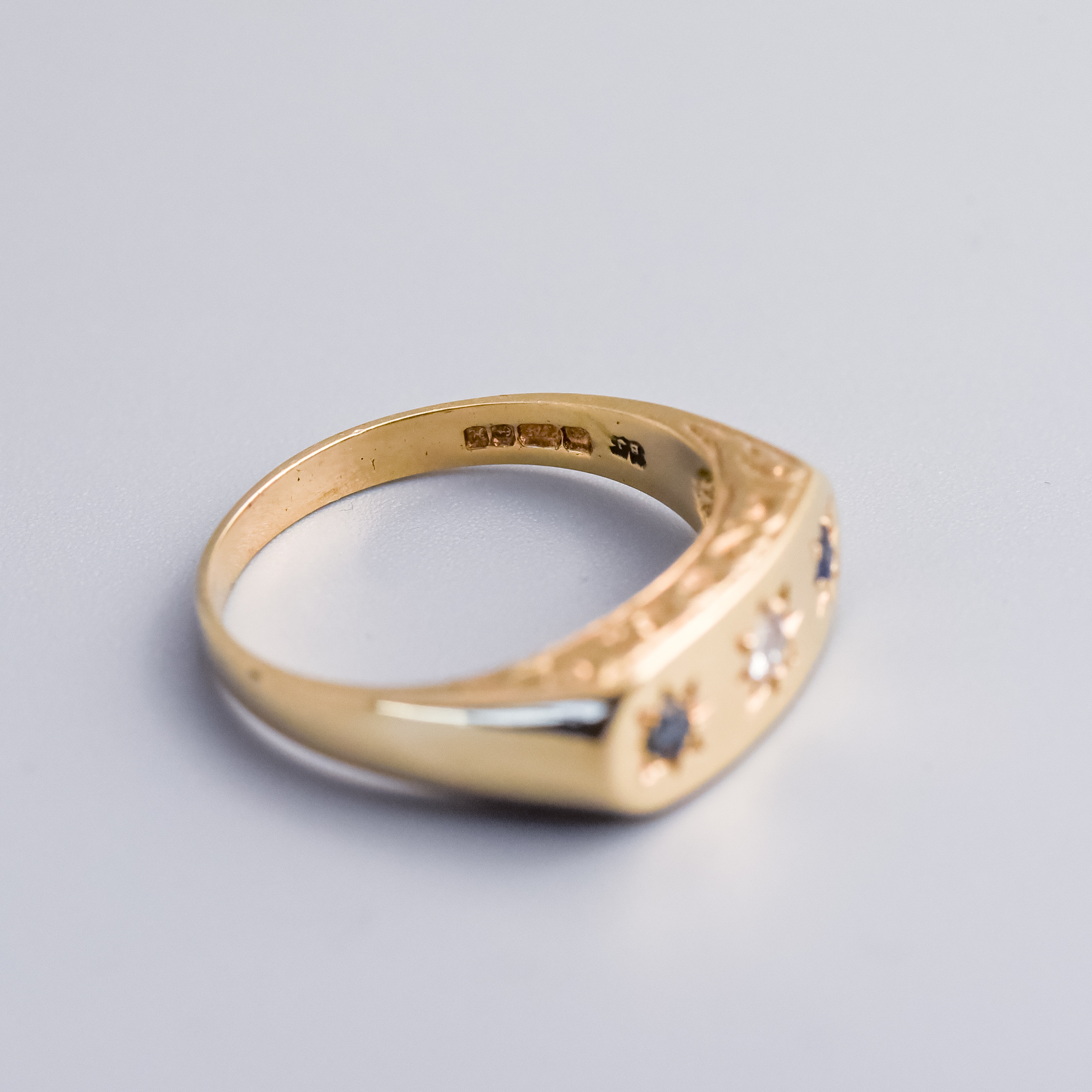 This 9ct gold sapphire and diamond gypsy ring features a gently curved face, centred with an old European cut diamond set flush into the band within a star-etched setting.