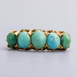 Surrounding the crescents are delicate cabochon turquoise gemstones, adding subtle colour contrast.