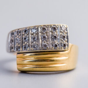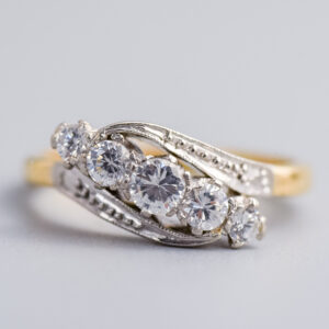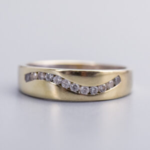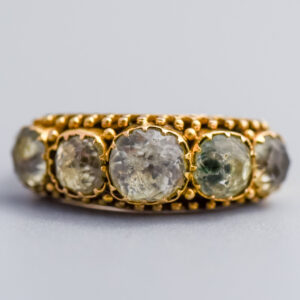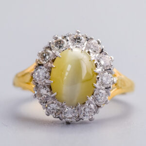This Victorian ring centres on an oval cabochon green cat’s eye gemstone, held securely in a twelve-claw setting that shows off its soft, shifting chatoyancy.