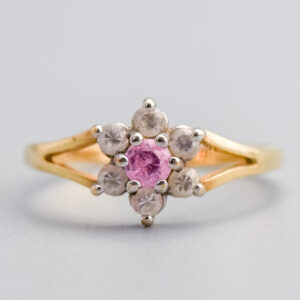 Surrounding it is a delicate halo of twelve seed pearls, creating a lovely antique cluster arrangement.