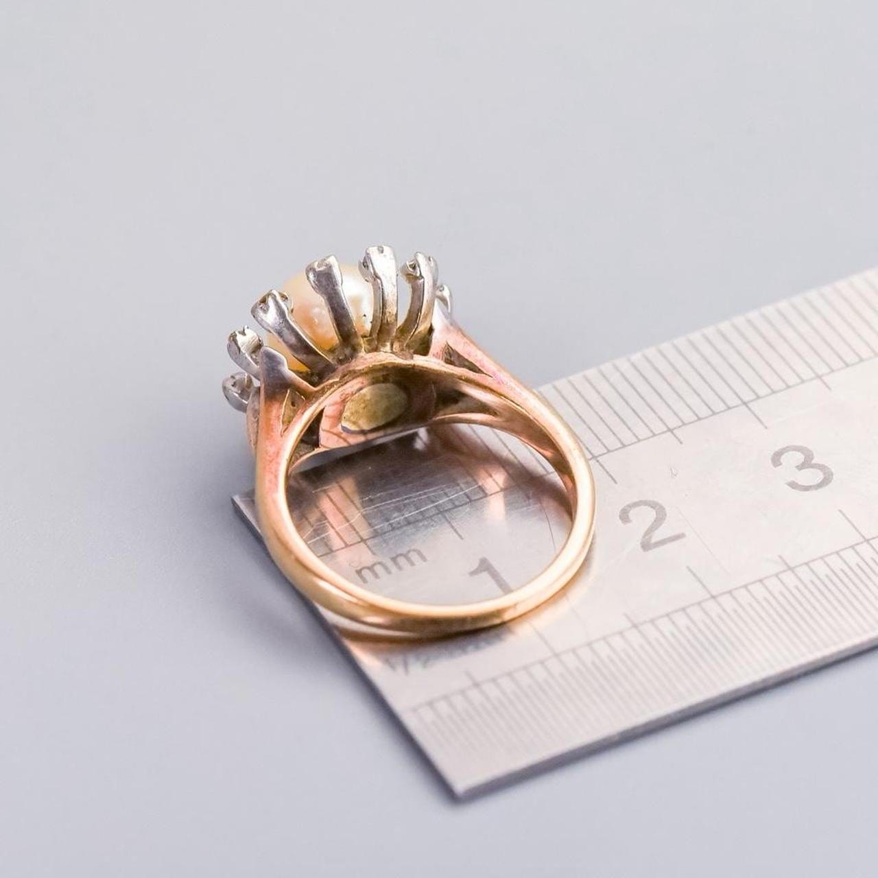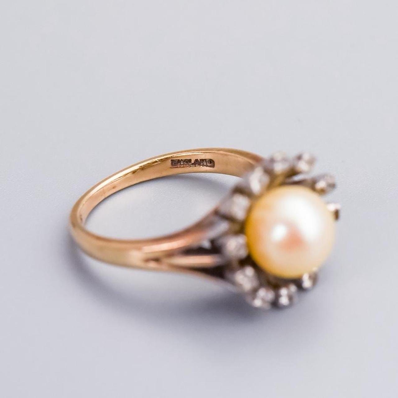 This antique 9ct gold ring features a central pearl, pin-set at the heart of the design.