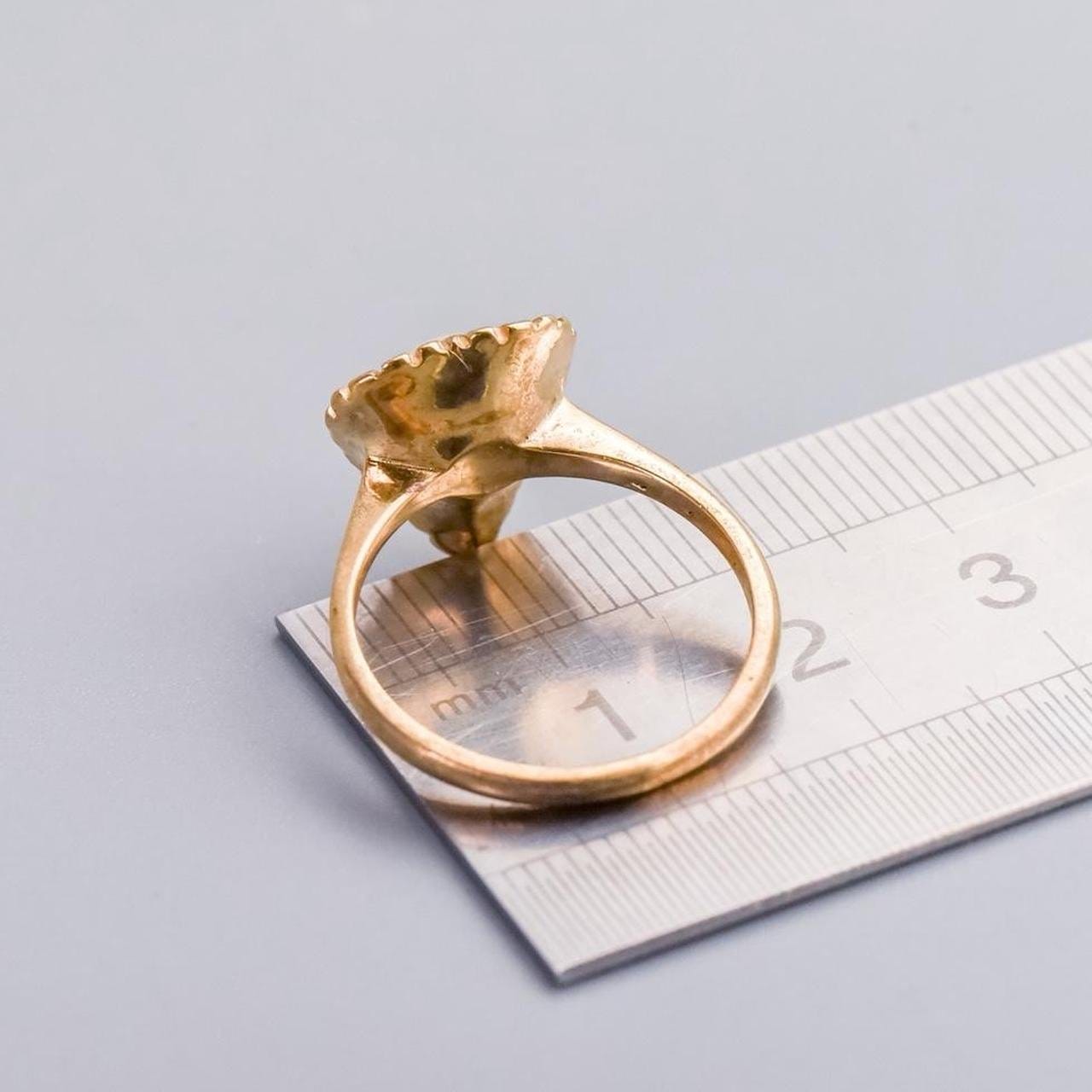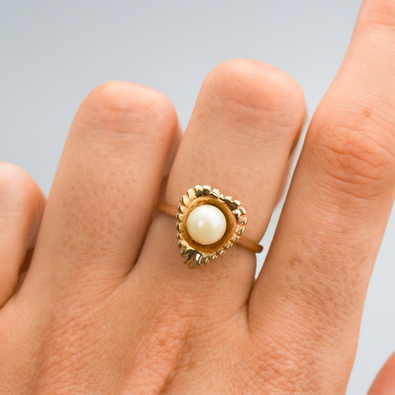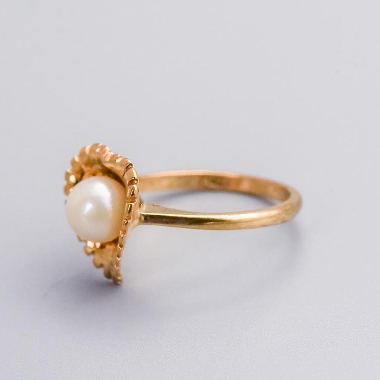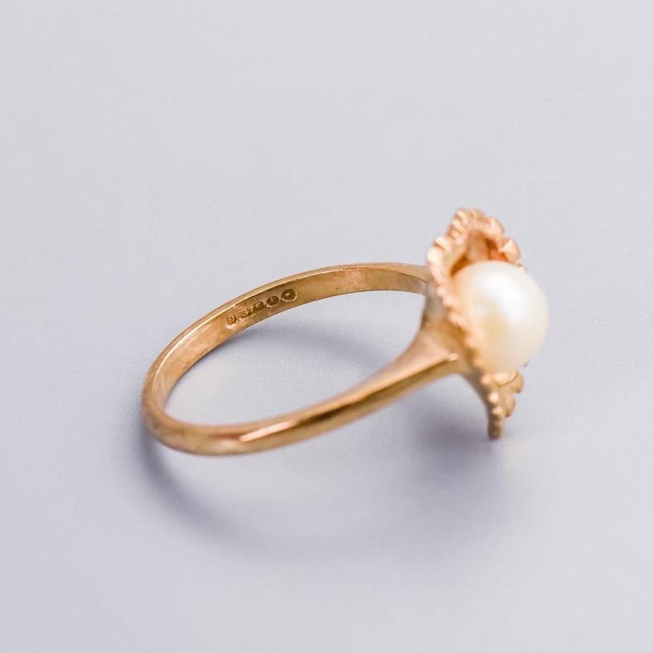 This 9ct gold ring is a mid-century design featuring a single pearl set at the centre of a polished gold leaf.