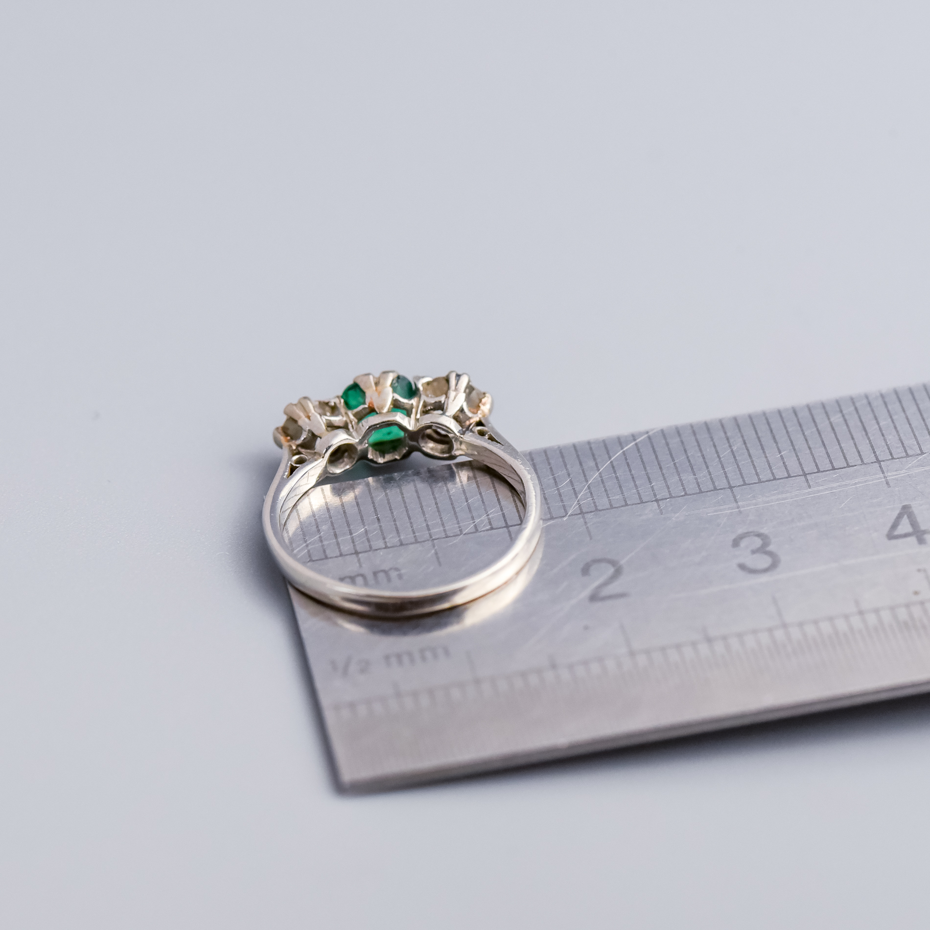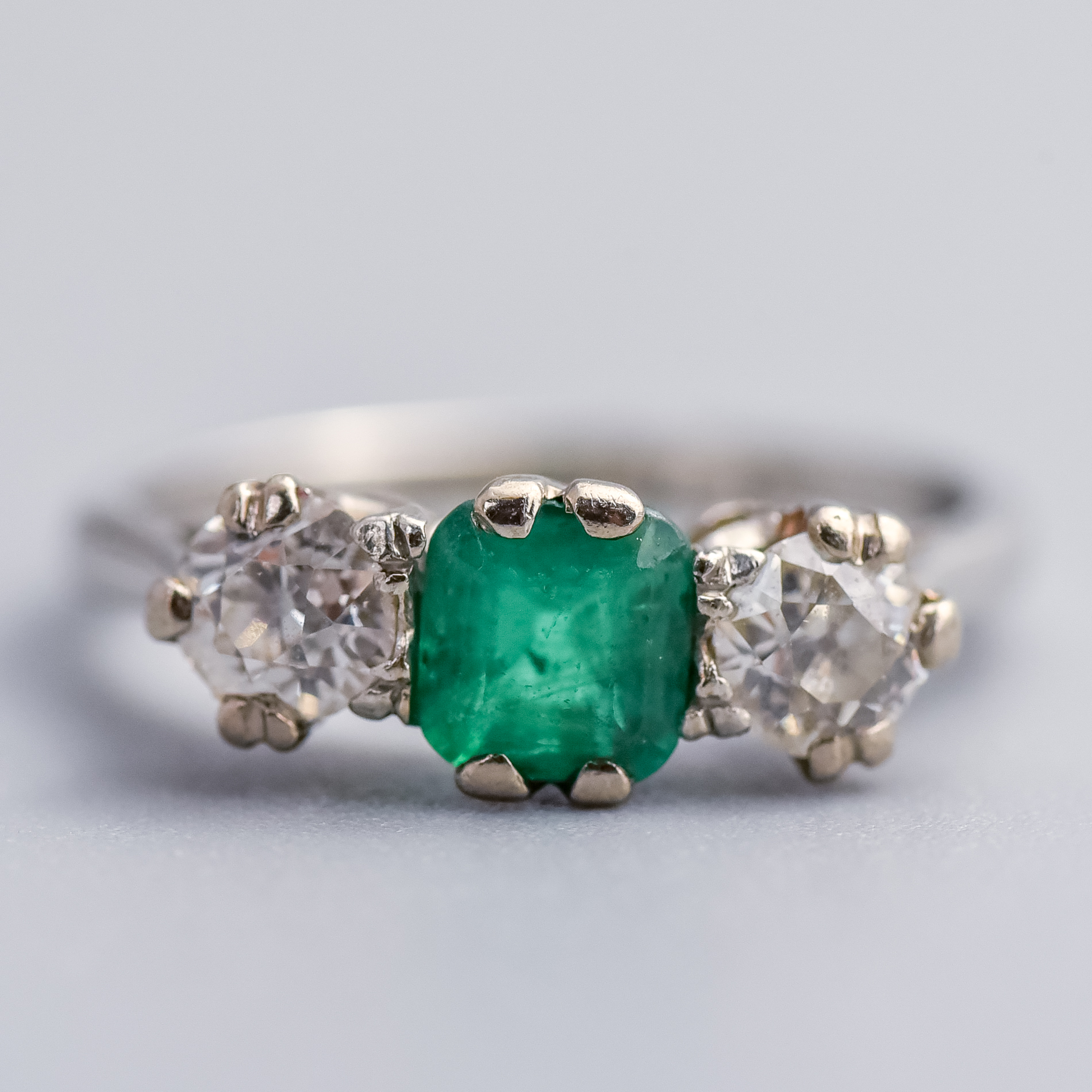 A classic Platinum ring featuring a central emerald-cut green emerald in a secure four-claw setting. On either side, old mine-cut diamonds are set in delicate double-claw settings, creating a traditional three-stone composition.